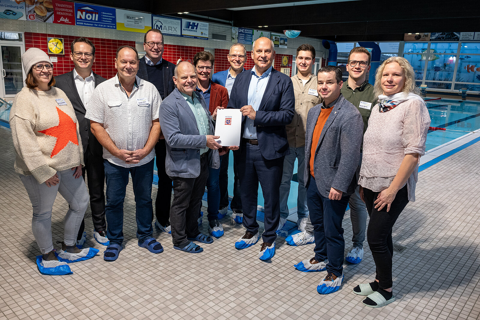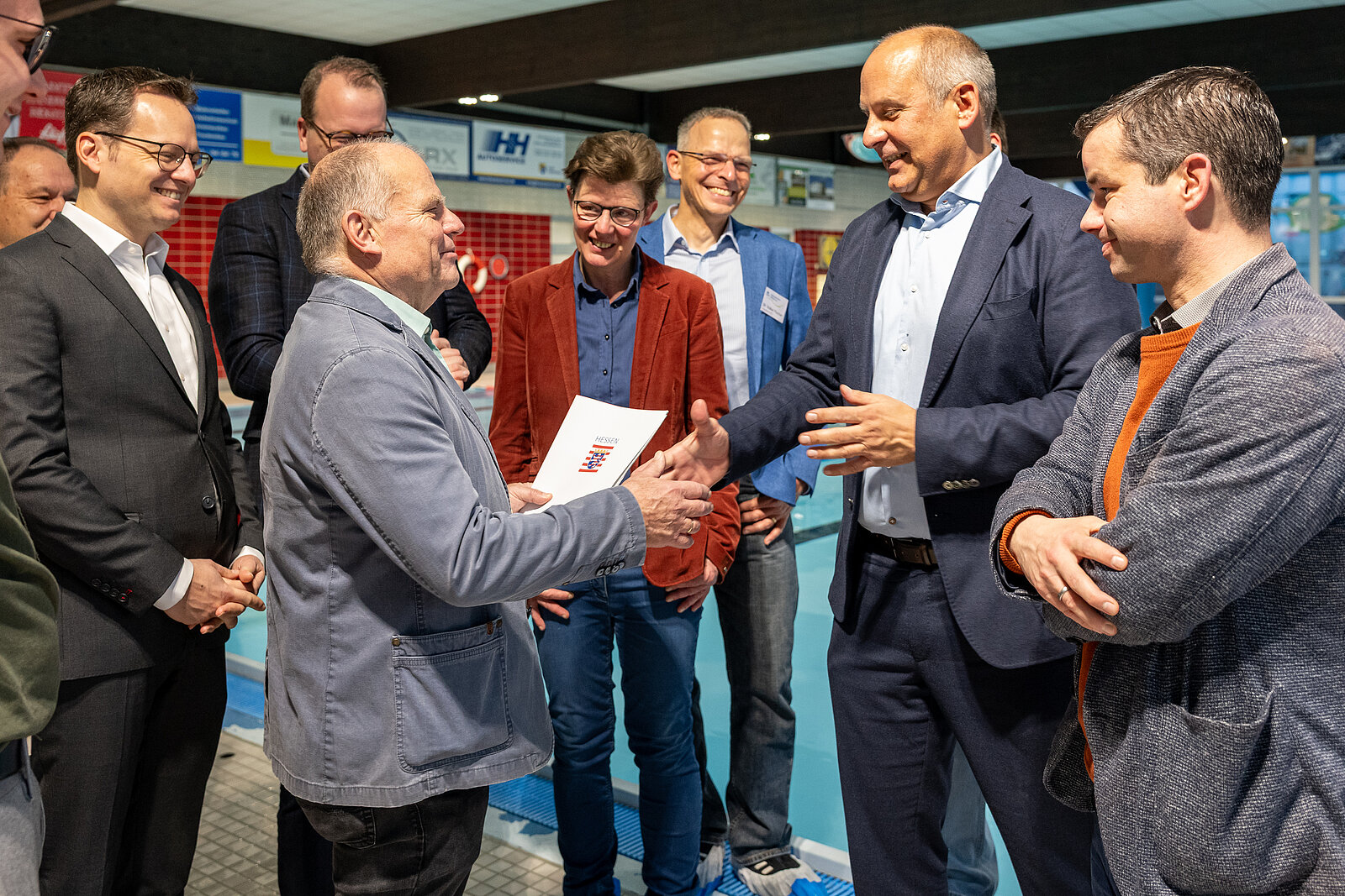 Bei der Übergabe des Zuwendungsbescheids betonte Innenminister Roman Poseck die Bedeutung einer attraktiven Bäderlandschaft für die Schwimmausbildung und Schwimmfähigkeit der Menschen: