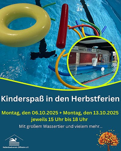 Da die Vereine in den Herbstferien mit den Schwimmkursen pausieren, nutzt der Hallenbadverein die freie Zeit und bietet an den zwei Montagen zwischen 15:00 Uhr und 18:00 Uhr einen kleinen Kinderspaß an.