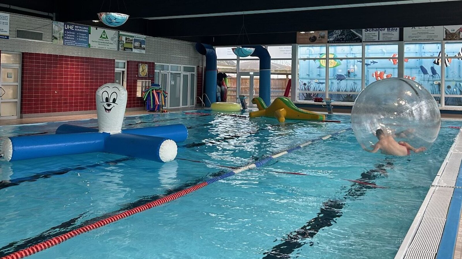Große, mit Luft gefüllte Tiere, Schwimminseln, Plattformen, Wasserbälle und weitere Spielsachen laden dann zum Spielen und Toben im gesamten Hallenbad ein.